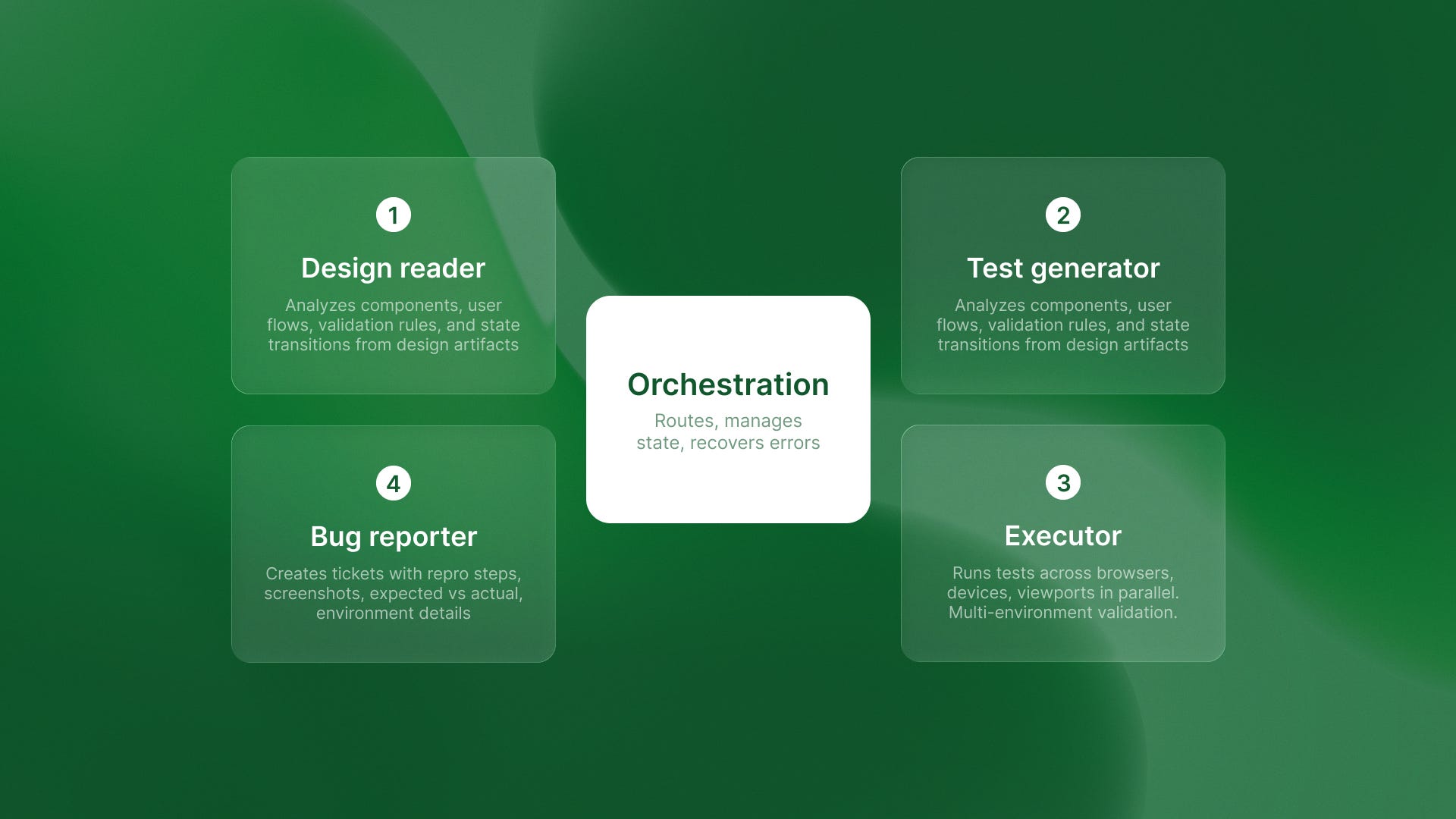 True autonomous testing works differently. The architecture is multi-agent, and the workflow is generation, execution, reporting.