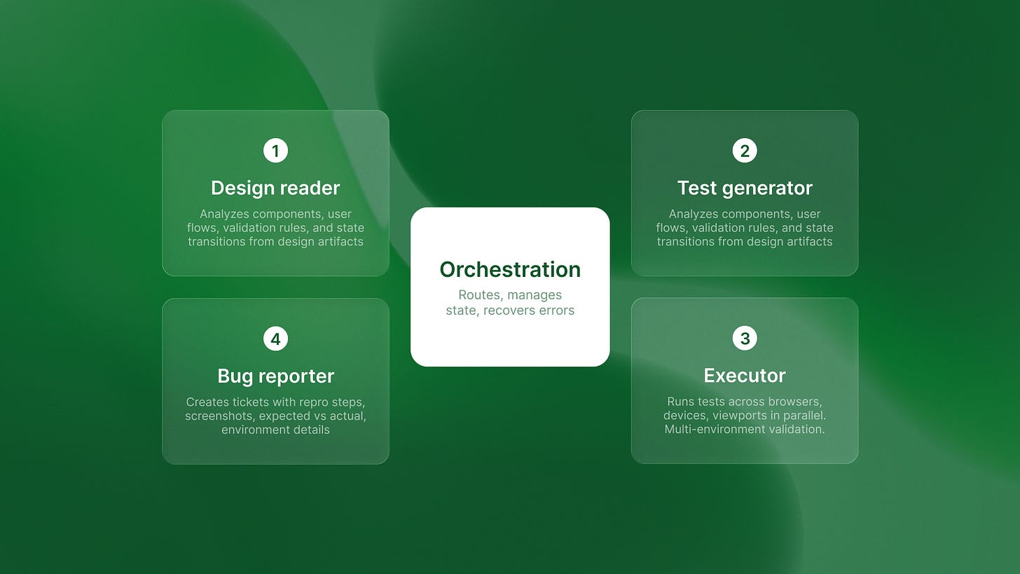 Agent 2 generates test scenarios from that intent. Not from human specifications. From the design itself. If Figma shows a login screen with email and password fields, the system assumes a test for an invalid email format. No one needs to write it.